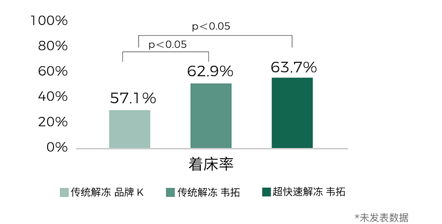超快速解冻与传统解冻无统计学差异,均符合临床应用要求,可兼容不同品牌冷冻试剂。韦拓超快速解冻方法表现出色,实现优异的胚胎存活率与临床妊娠结局。1
