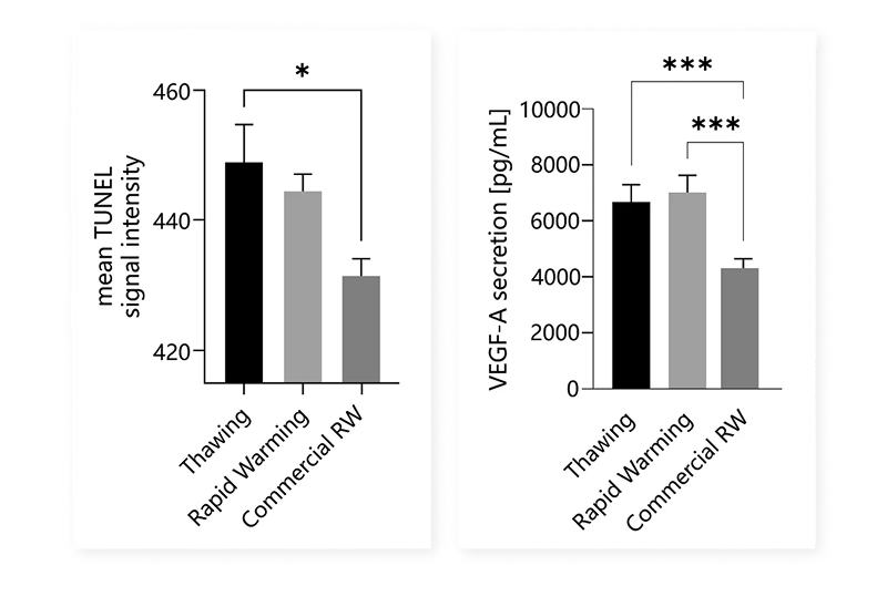 凋亡水平显著低于常规解冻组(TUNEL检测,p=0.014) VEGF-A 应激分泌量最低(结合凋亡数据提示组织损伤最小)